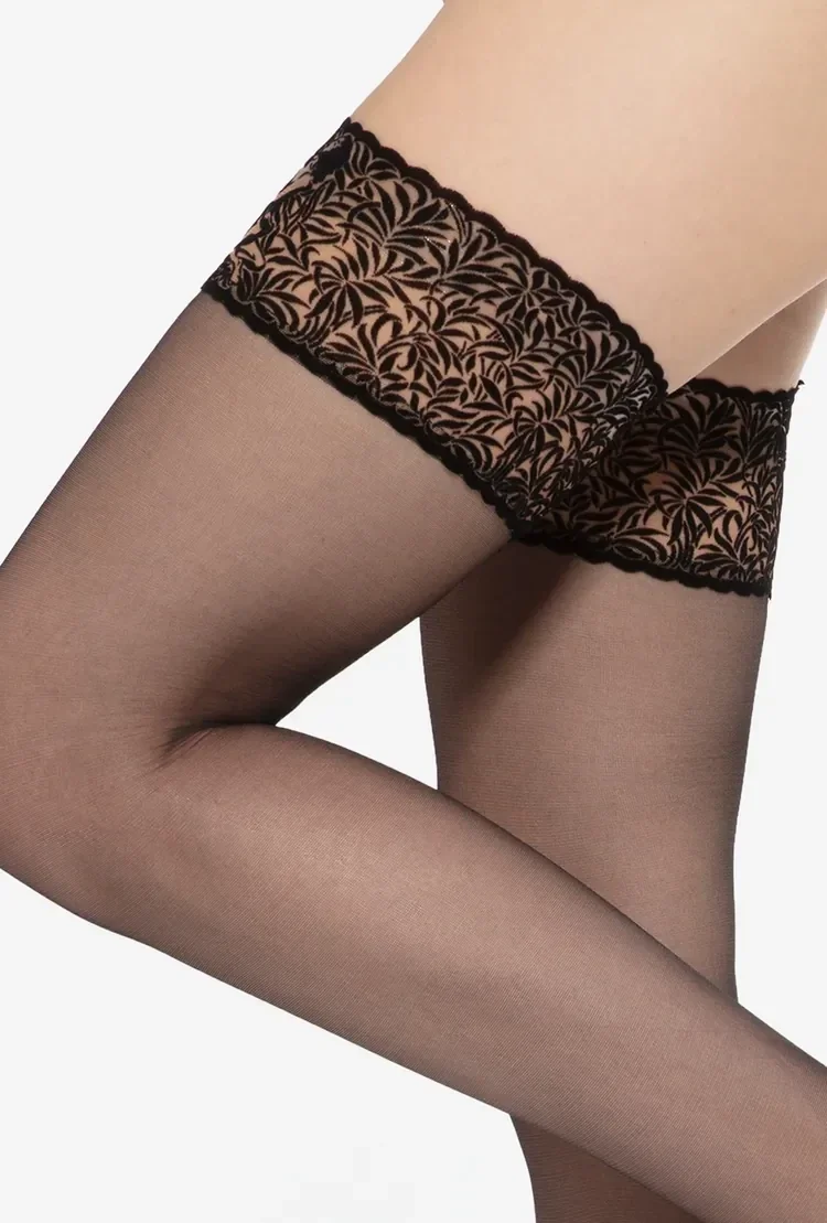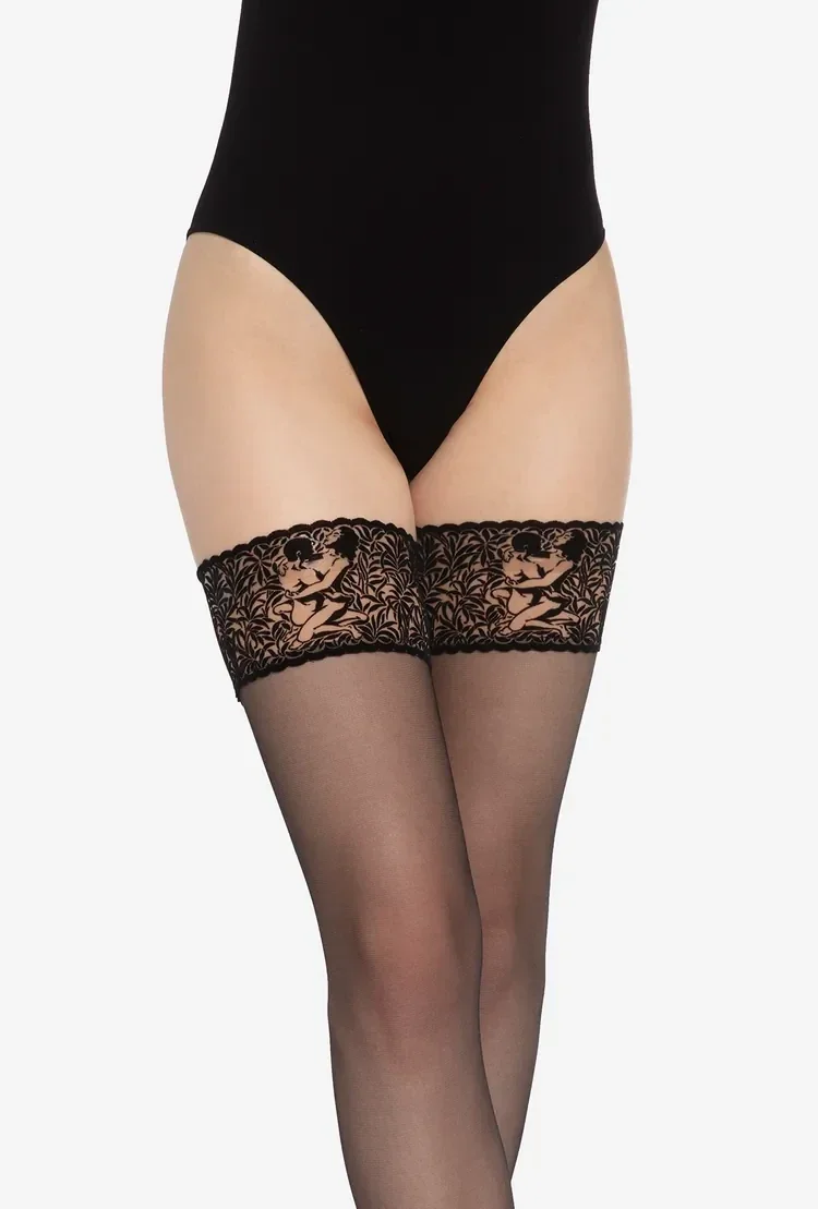 Elegante, hold-up kousen. De vezel Lycra heeft een grote elasticiteit, keert altijd terug naar zijn oorspronkelijke vorm. Hierdoor zijn de kousen elastisch, resistent een passen ze zich gord een de huid aan.