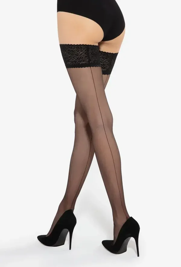 Klassieke kousen van 15 denier, versierd met een lijn langs de achterkant.en afgewerkt met een kanten band. De gebruikte Lycra zorg voor optmaal comfort, zelf bij langdurig dragen. Denkzij de uitzonderlijke elasticieit sluiten ze perfect aan over de hele lengte van het been.